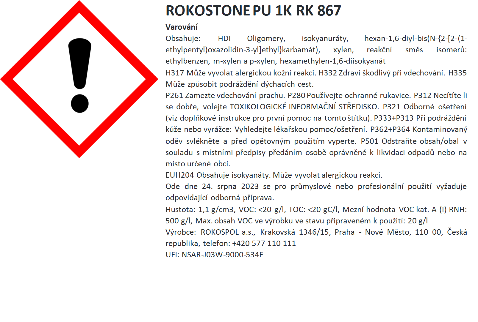 Výrobek obsahuje 0,1 % nebo víc volných diisokyanátů. Od 24. srpna 2023 se pro průmyslové nebo profesionální použití vyžaduje odpovídající odborná příprava.