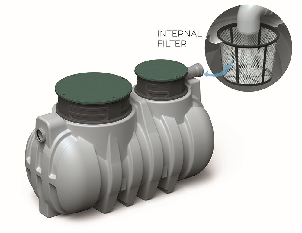 - Pod nástavcem se nachází otvor o průměru 290 mm s filtračním sítem, které zabraňuje nečistotám vstupujícím do nádrže.