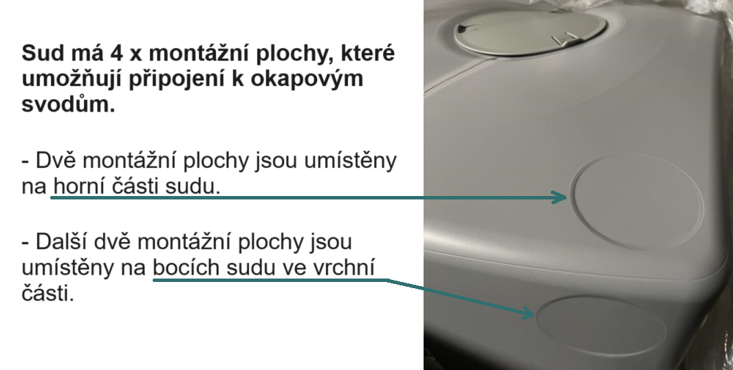 - Sud má čtyři montážní plochy, které umožňují připojení k okapovým svodům. Příslušenství pro napojení na okapový svod, včetně videonávodu, naleznete v kategorii Příslušenství k sudům.